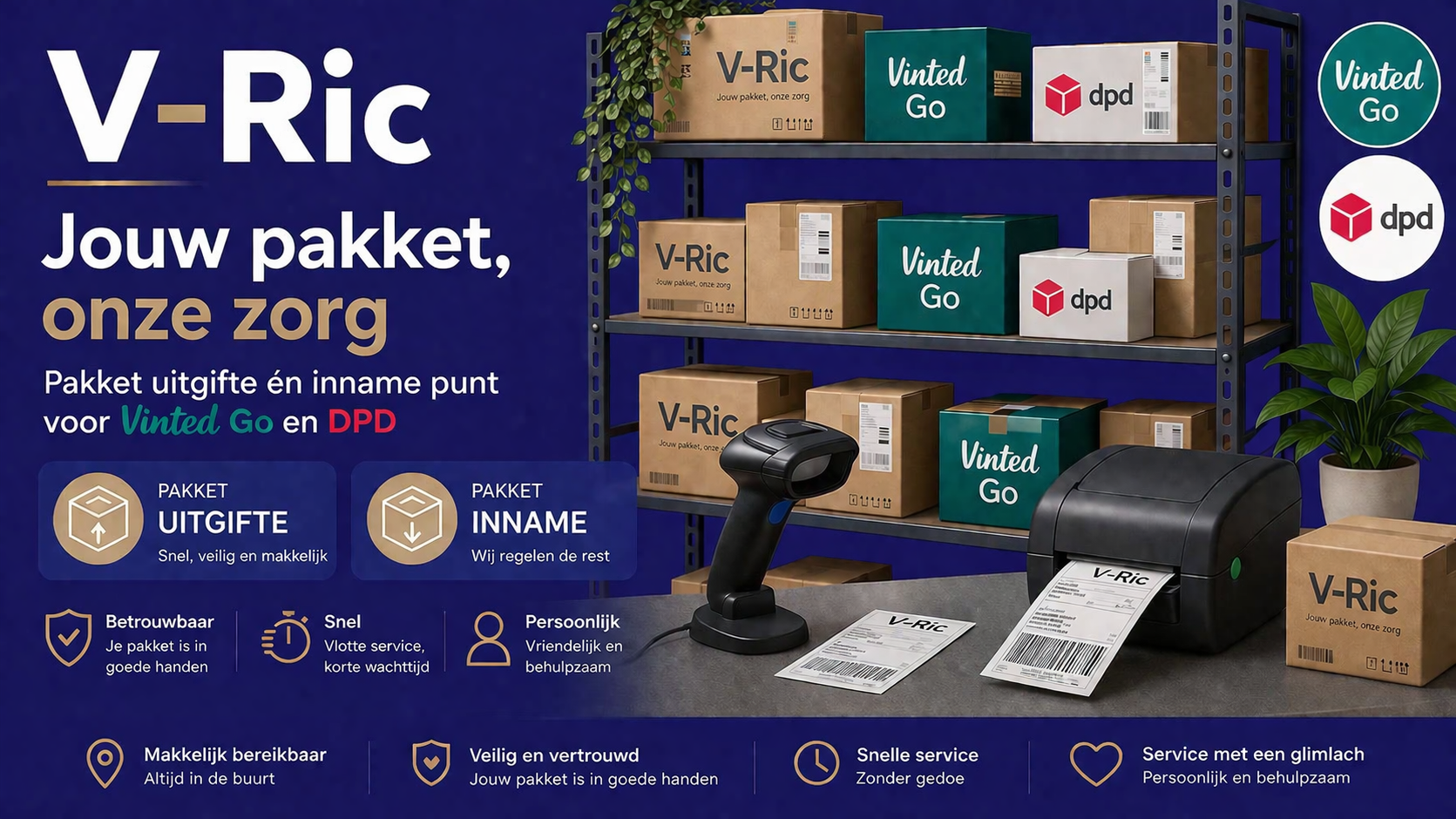 Het bedrijf V-Ric werkt vanuit huis en zijn van Maandag t/m Vrijdag geopend van 13.00 - 20.00 uur. En op zaterdag van 10.00 - 12.00 uur. Met een team van 3 personen werken wij samen met VINTED GO Pakketwinkels en DPD. Wekelijks verwerken wij 500+ pakketten en zorgen wij er tegelijkertijd voor om een gezellig praatje aan de deur te houden.